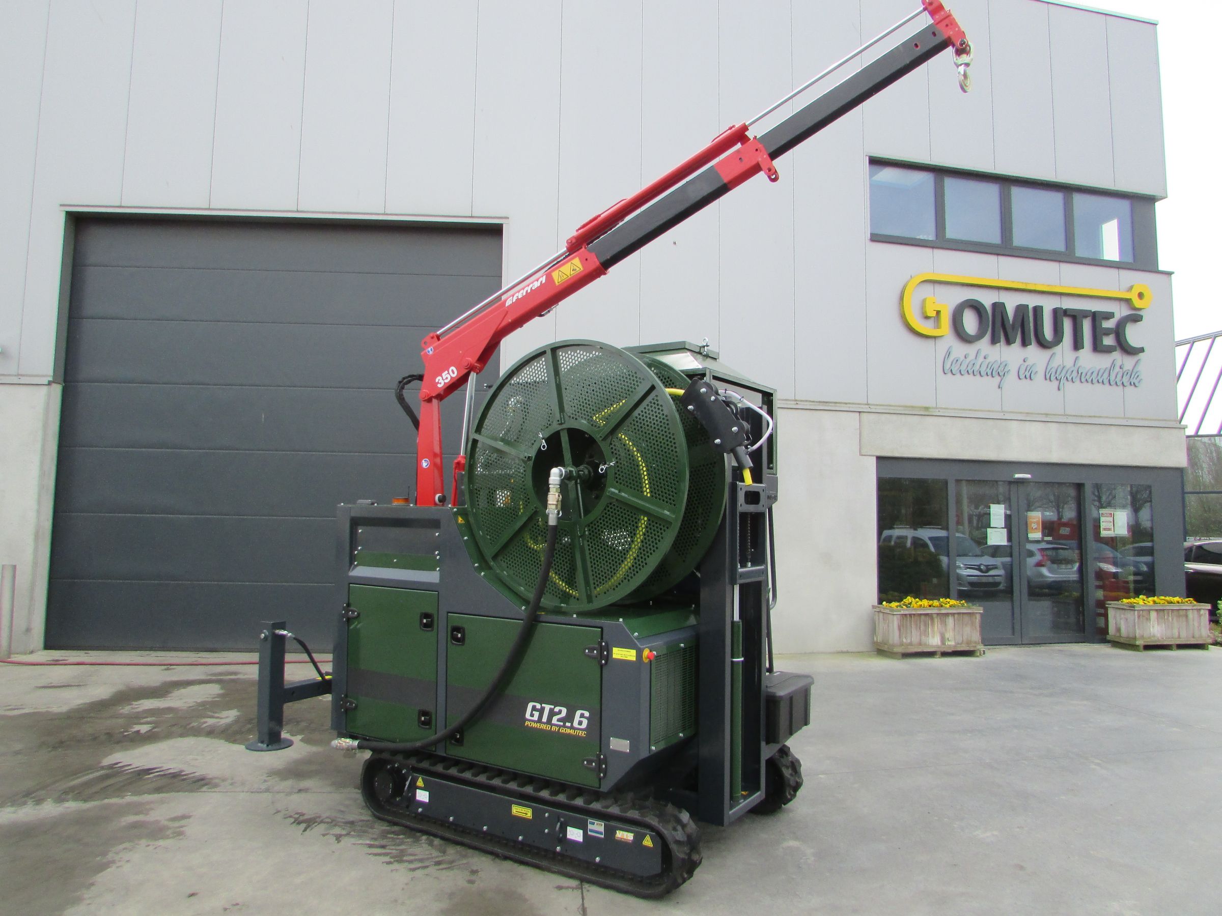 Grouthaspel met capaciteit van 180m PE-slang 32mm, kan in vrijloop geplaatst worden alsook automatisch terugtrekken, de diepte van de slang wordt weergegeven en geregistreerd in de Cloud
